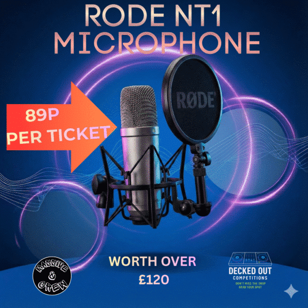Enhance your recording setup with the renowned Rode NT1, celebrated for its exceptionally low self-noise, natural warmth, and professional studio clarity. For only 89p per ticket, you have the opportunity to own one of the quietest and most respected condenser microphones on the market.